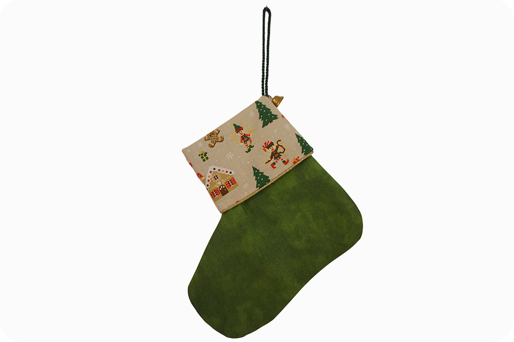 Die Nikolaussocke ist innen mit einem hellen Weihnachtsstoff gefüttert und der Bund wird durch eine goldene Paspel geziert. Durch das kleine Glöckchen am Ende der dunklegrünen Kordel hört man gleich, wenn die Socke mit der einen oder anderen Leckerei gefüllt wird.