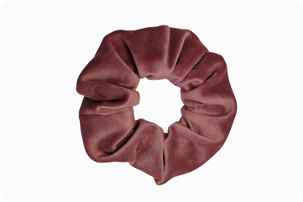Aus dickem, samtigem Stoff ist dieser alrosa-farbene Scrunchie genäht. Er lässt sich um einen Dutt herumschlingen, um den Übergang zwischen Kopf und Haarknoten zu verschönern, genauso gut macht er sich aber auch an einem Pferdeschwanz.