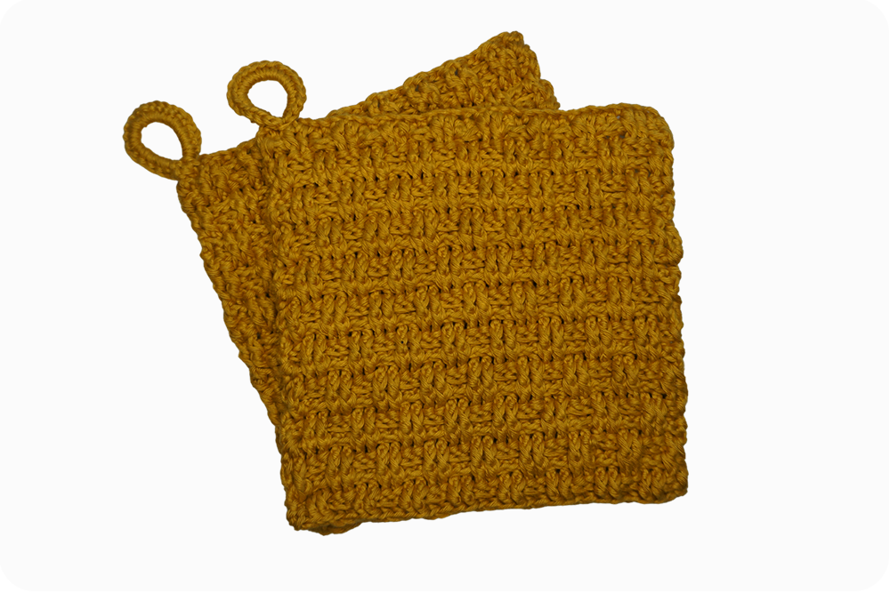 Die Topflappen sind aus einem hochwertigen Baumwollgarn handgehäkelt und schimmern in einem kräftigen Goldgelb. Ihr schöner Reliefeffekt sticht gleich ins Auge und macht sie zu einem besonderen Hingucker in der Küche.