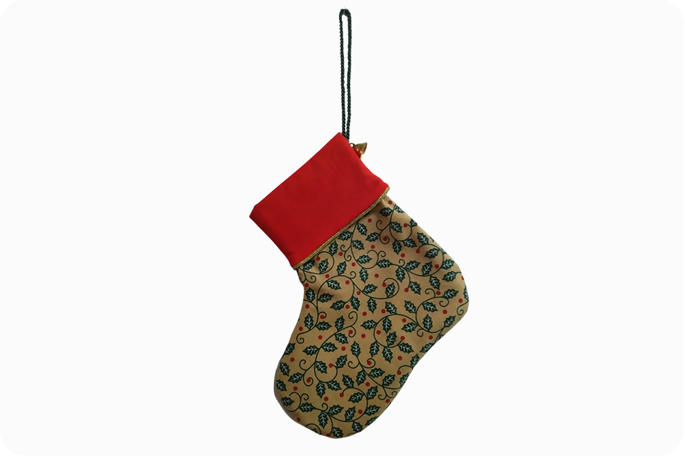 Die Nikolaussocke ist innen rot und der Bund wird durch eine goldene Paspel geziert. Durch das kleine Glöckchen am Ende der dunkelgrünen Kordel hört man gleich, wenn die Socke mit der einen oder anderen Leckerei gefüllt wird.