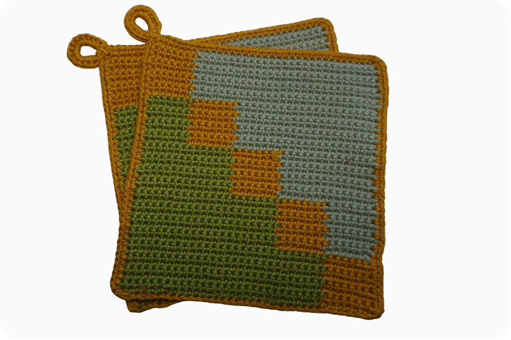 Die Farbkombination aus hellblau, gelbgold und hellgrün ist ein echtes Highlight – dezent, aber doch auffällig genug für Topflappen in jeder Küche, die schnell griffbereit sein sollen. Die Topflappen sind aus hochwertigem Baumwollgarn handgehäkelt.