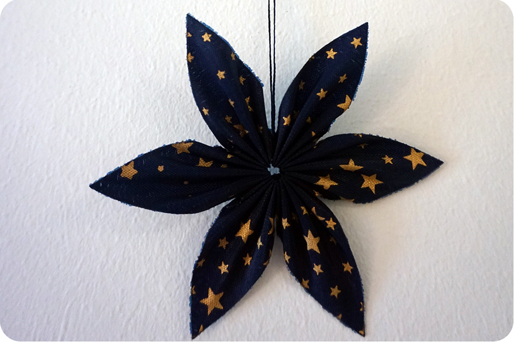 Der dunkelblaue Stern aus einem etwas dünneren Stoff ist auf der Vorderseite mit kleinen, kupferfarbenen Sternchen bedruckt. Er lässt sich wunderbar ins Fenster oder an einen Ast hängen, auch am Weihnachtsbaum oder als Dekoration auf einem winterlich belegten Teller ist er ein toller Hingucker.