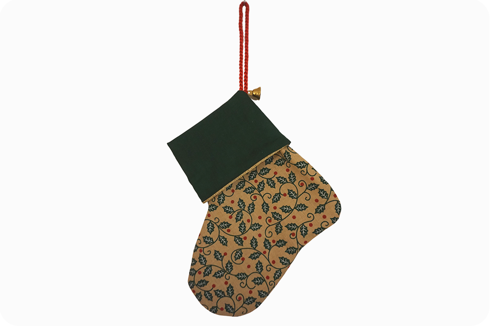 Die Nikolaussocke ist innen grün und der Bund wird durch eine goldene Paspel geziert. Durch das kleine Glöckchen am Ende der roten Kordel hört man gleich, wenn die Socke mit der einen oder anderen Leckerei gefüllt wird.